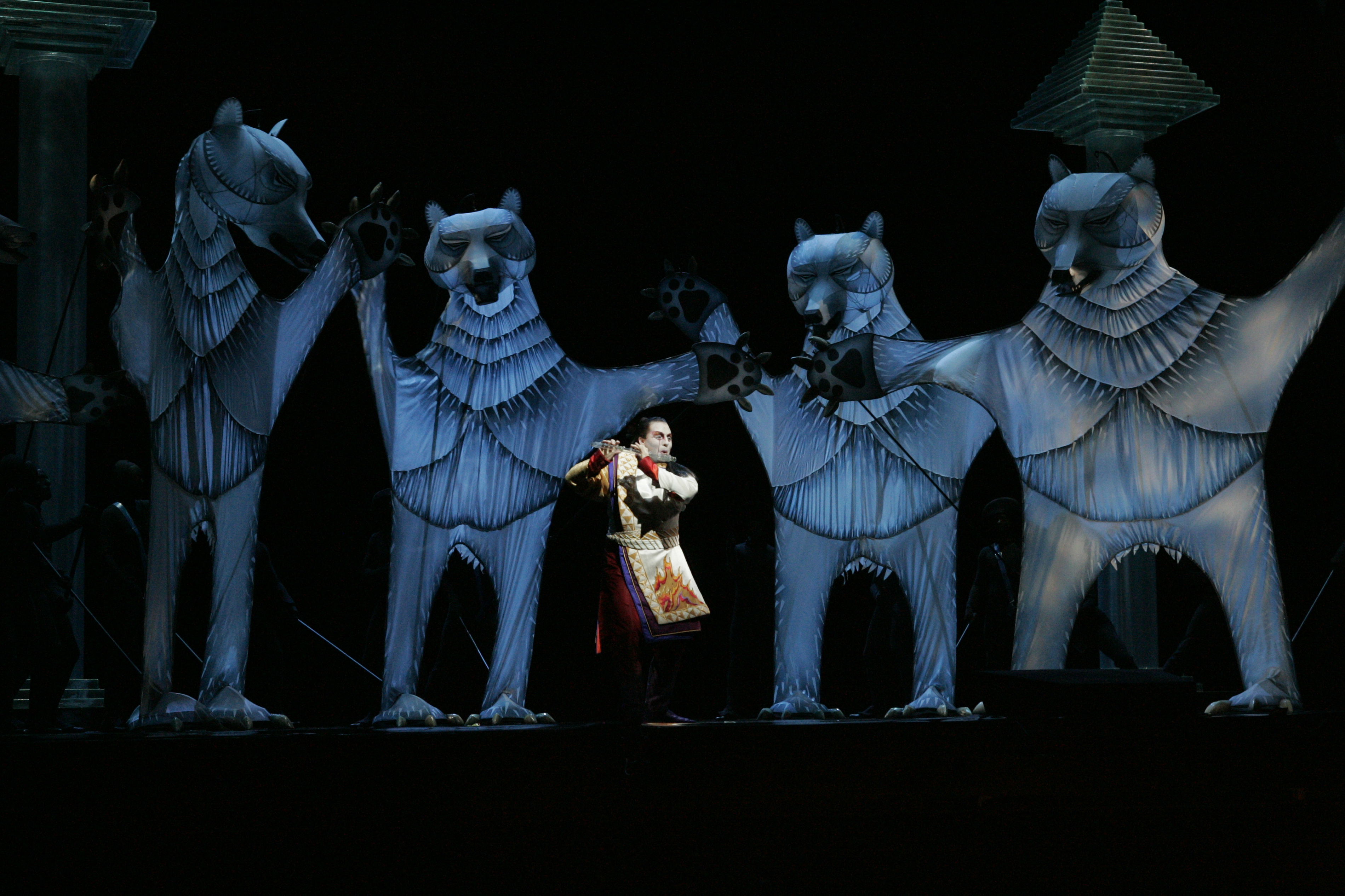 Julie Taymors fantasirike oppsetning kombinerer sang, dukketeater og eventyr, og er en engelsk versjon tilrettelagt av J. D. McClatchy.
